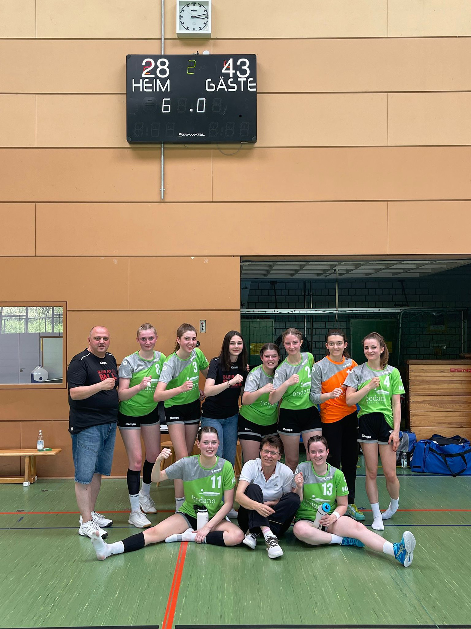 Mit einem 6:0-Lauf begann unsere weibliche A-Jugend ihr letztes Saisonspiel bei der HSG Oberer Hegau in Engen. Diesen Vorsprung festigte man im weiteren Verlauf bis kurz vor Halbzeitpause, ehe die Gastgeber mit drei Toren in Folge den Rückstand verkürzten. In den Anfangsminuten der zweiten Halbzeit schalteten unsere Mädels wieder einen Gang höher, zogen Tor um Tor davon und waren dem Gegner körperlich und technisch überlegen. Mit einem deutlichen Auswärtserfolg sicherte die Mannschaft um Trainergespann Carolyn Häberle und Ali Satici einen sehr guten 3. Tabellenplatz. Vielen Dank im Namen des Vereins für die geleistete Arbeit des nach Saisonende scheidenden Trainer Ali Satici!